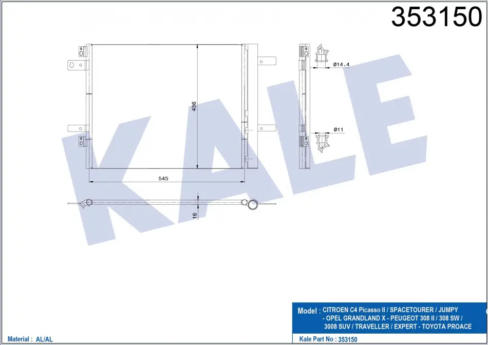 KALE CITROEN Радиатор кондиционера C4 Grand Picasso,Jumpy,Spacetourer,Opel Combo Tour,Grandland,Peugeot 3008/308,508,Expert 353150 KALE OTO RADYATOR