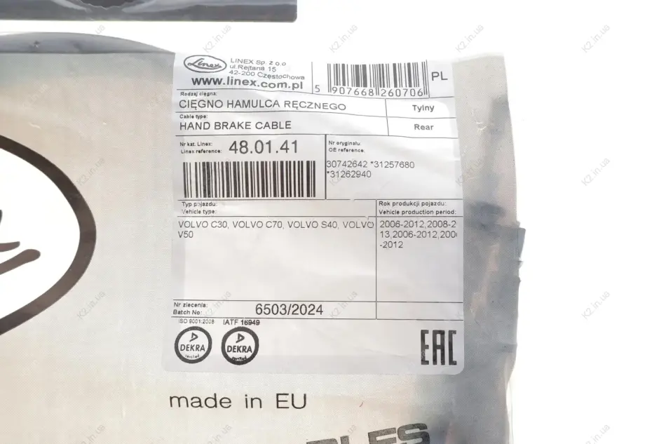 Трос ручника (задній) Volvo C30/C70/S40/V50 03-13 (1816/1860mm) 48.01.41 LINEX