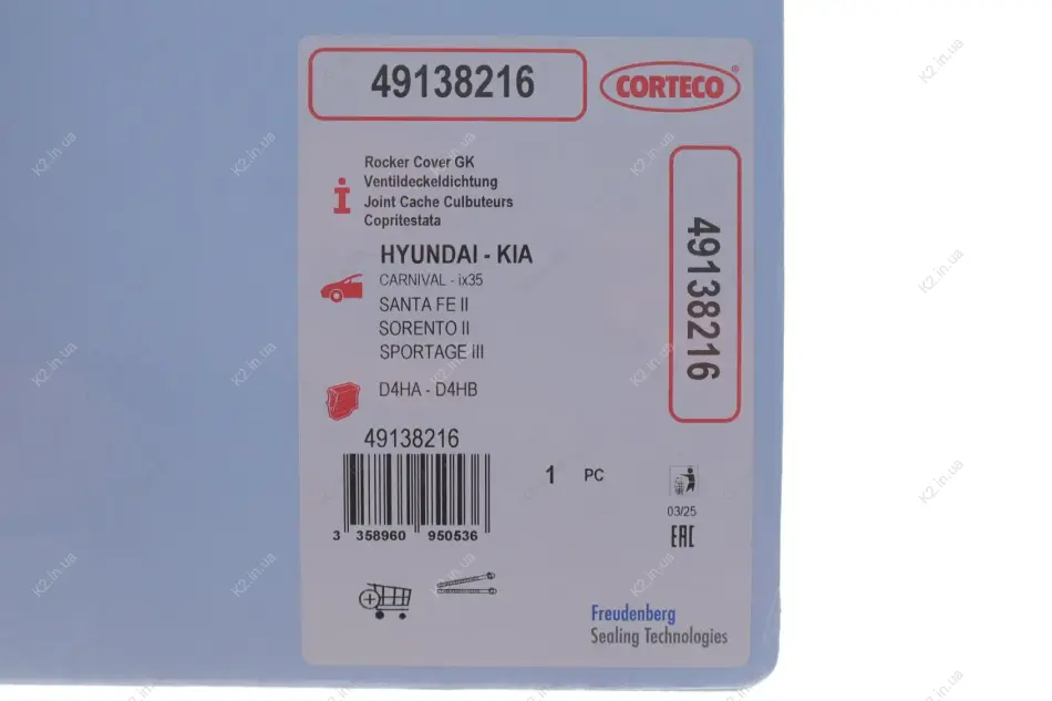 Прокладка кришки клапанів Hyundai Santa Fe/Kia Sportage 2.0/2.2 CRDi 06- (комплект) 49138216 CORTECO