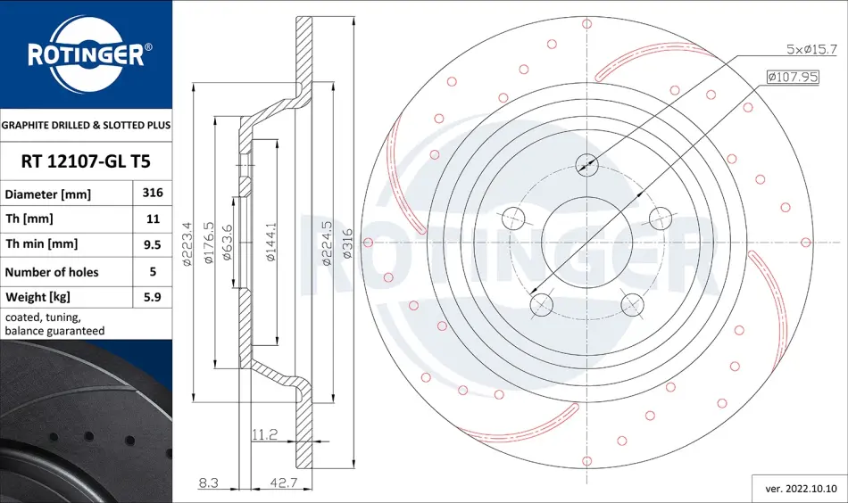 Диск тормозной с перфорацией и слотированием с графитовым покрытием RT12107-GLT5 ROTINGER