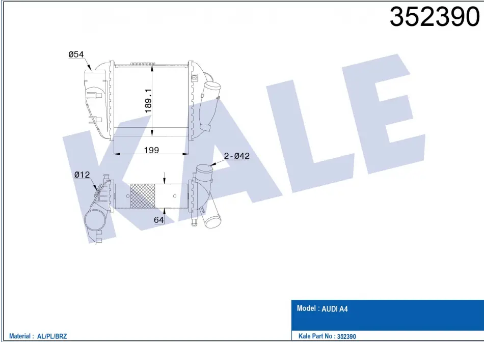 KALE VW Интеркулер Audi A4 2.5TDI 00- № шасси от: от 8E-2-117 001 352390 KALE OTO RADYATOR